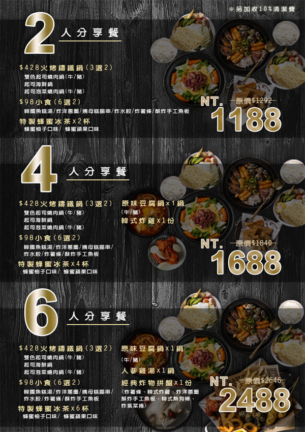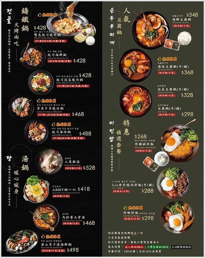 ▼菜單,除了有火烤兩吃的鑄鐵鍋之外,也有湯鍋、人氣豆腐鍋、套餐等,而且小菜吃不夠還可以免費續點,加上飯後甜點,包準可以吃得飽足又滿足!