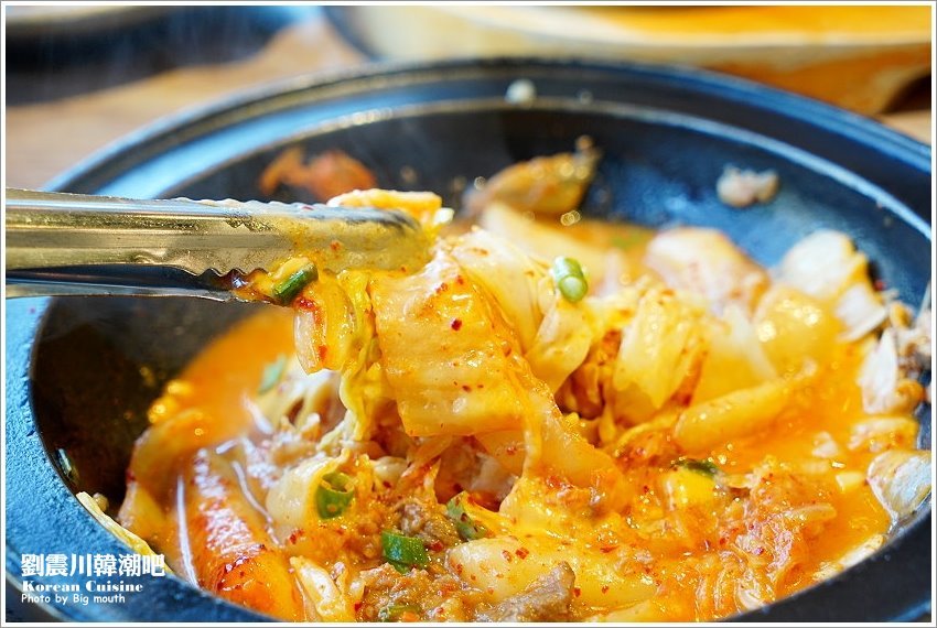 ▼起司泡菜燒肉鍋,也是火烤兩吃的吃法!一開始先採用醃漬肉片搭配泡菜、起司、甜甜辣辣的韓式年糕搭配蔬菜下去火烤,完全沒有加一滴水,裡頭都是食材的湯汁精華,吃完之後才會加入高湯當成火鍋享用!