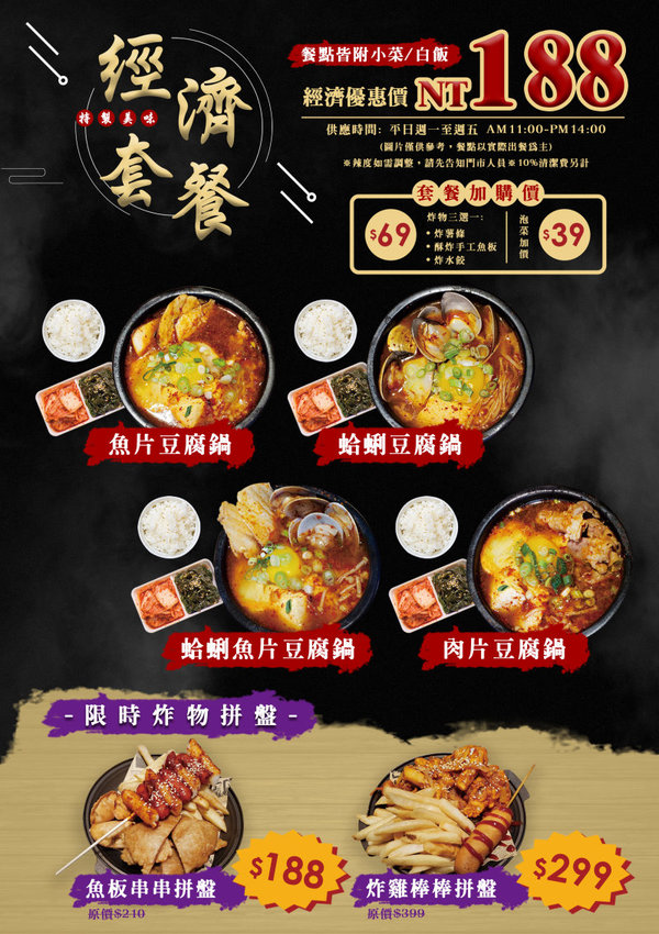 ▼平日午餐時間還有推出經濟套餐,主餐附小菜、白飯只要188元,還有套餐加購價及限時炸物拼盤,真的非常划算啊!