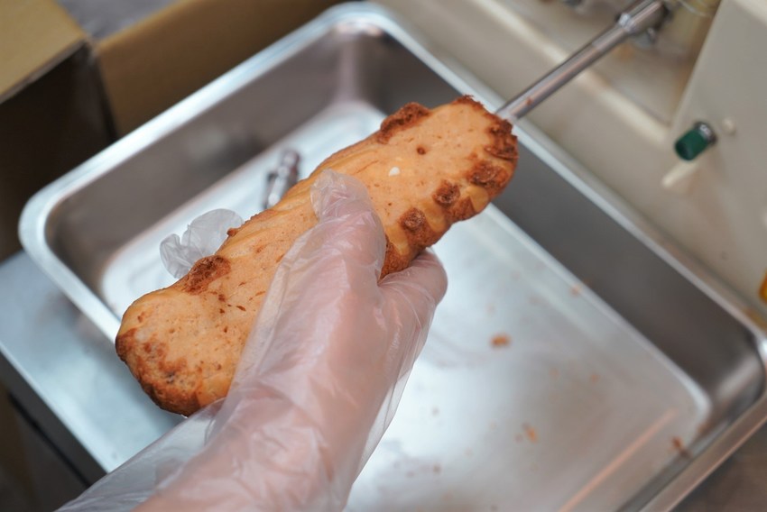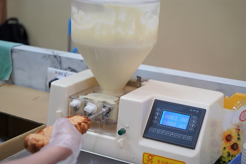 這兩台是灌泡芙的機器,可清楚看見巧克力與原味香草兩種口味。