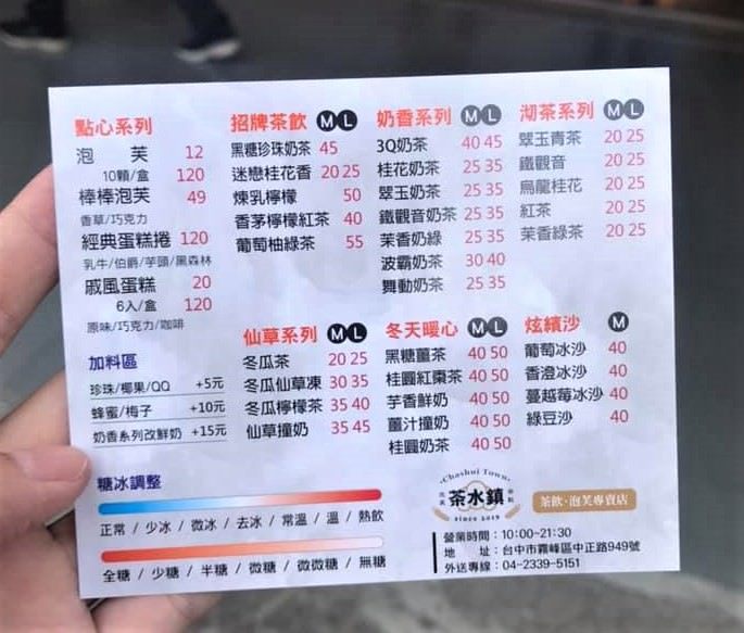茶水鎮位於霧峰市區的中正路上,招牌上有很明顯的泡芙照片,所以還算顯眼好找,茶水鎮主打的茶飲甜點價格還蠻平實的,所以當天前往的客人蠻多看起來像是亞洲大學、朝陽科技大學的學生,走過路過不能錯過的概念,趁剛開幕優惠趕緊來一波!