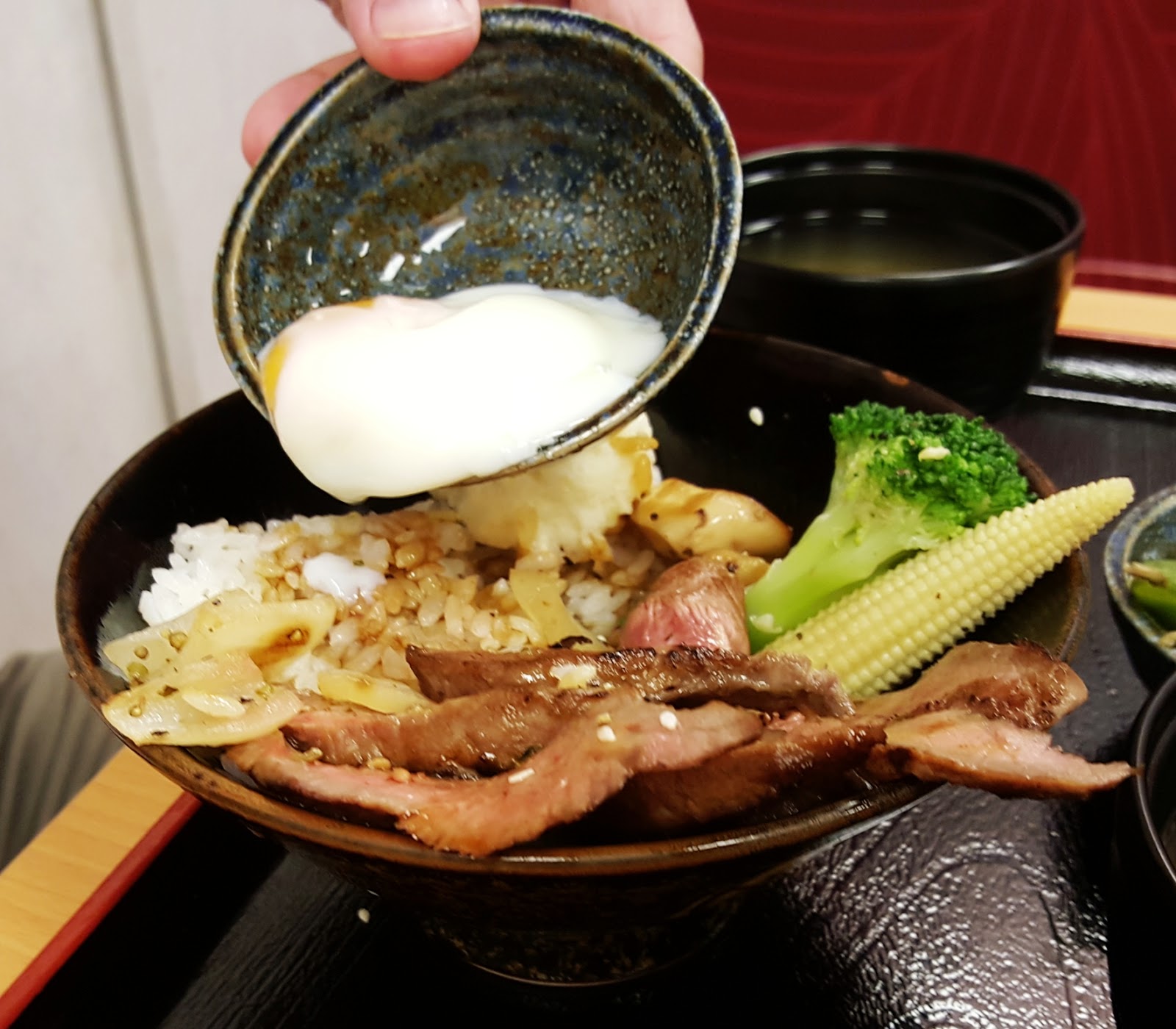 薄切嫩肩牛排丼上桌!擺盤配色一樣賞心悅目,光這樣看著,就覺得胃口大開。