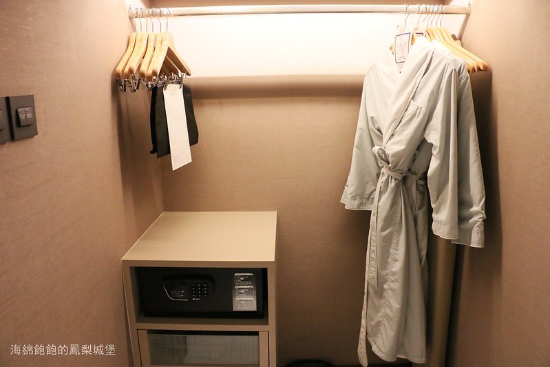 開放式衣櫃,裡面有浴袍、燙衣板跟熨斗