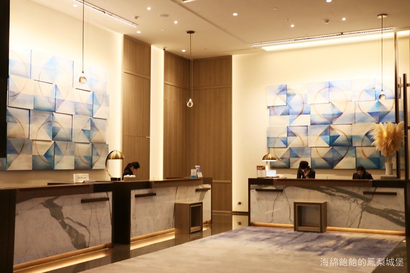 臺北新板希爾頓酒店的大廳挑高寬敞,幾何圖型裝飾