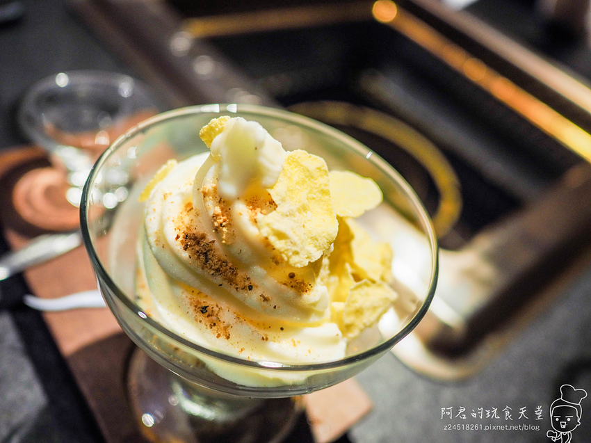 飯後甜點是霜淇淋跟桂圓木耳湯(熱),我自己是吃霜淇淋,份量給的不少,口感很綿密,是用鮮奶製作,味道挺濃醇的,一旁還有酥脆的玉米片可以配著吃。