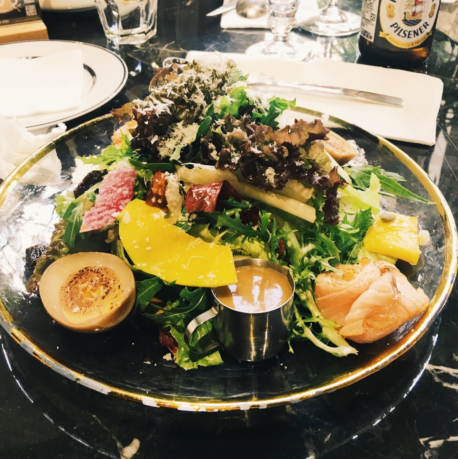 ■ 紹興溏心蛋炙燒鮭魚- 入口有層次的酒香溏心蛋,冰冰涼涼又有一股香氣與軟軟的口感,配上蔬菜與鮭魚,在口中清爽與風味的流竄很適合週末的午後。