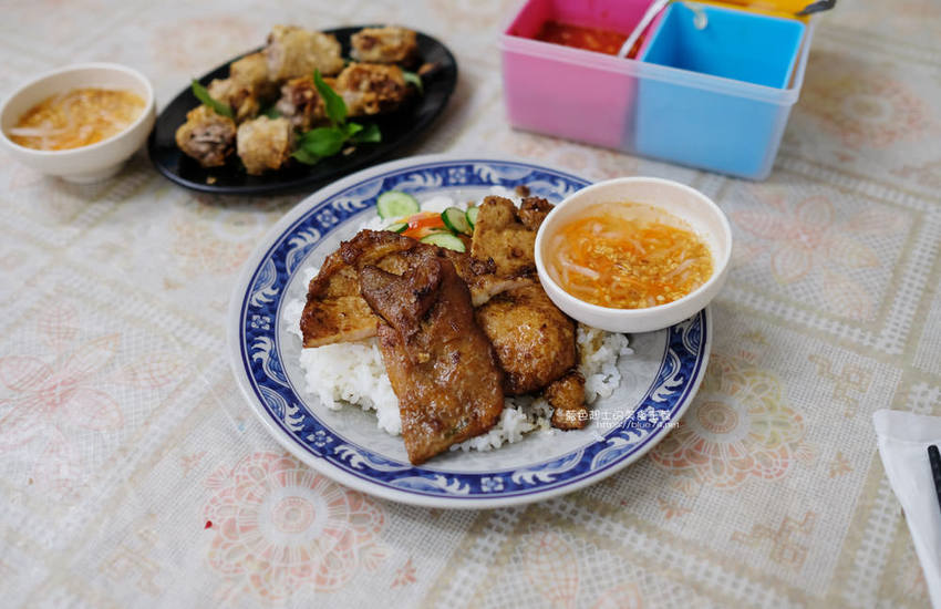底下飯量男生可以吃飽的量,稍黏一點,旁邊有番茄和小黃瓜切片,搭配沾醬著吃,我最喜歡越南小吃的沾醬了,肉排比較有咬感,有入味。