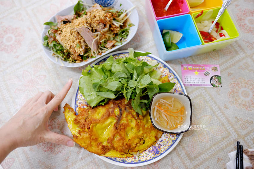 手直接來一張比例尺,台中比較少見的越南煎餅,旁邊有生菜跟九層塔,沾醬跟生春捲的是一樣的。