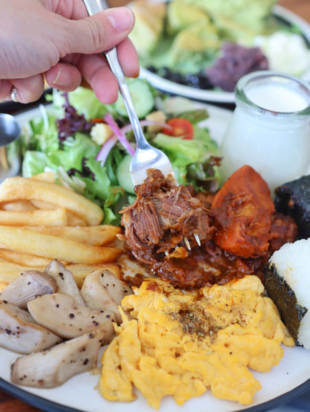 ▫️配餐滿滿一盤相當豐富都是原型食物,營養均衡、份量足。主食有厚鬆餅/飯糰/吐司可選,我唯一鍾愛日式飯糰,微微烤過的外層裏頭還有包餡,單吃也沒問題。炒蛋跟菇料理調味簡單,品嘗食材本身原味,好的食材確實不需要過多調味料來妝點。自家磨的豆漿豆香濃,喝不夠的話可以直接單點一杯。沙拉醬有千島、和風、甜酒醋三種可選,都是店家自製的安心調料,生菜本身很新鮮,建議選後面兩者較為清爽的醬料搭配
