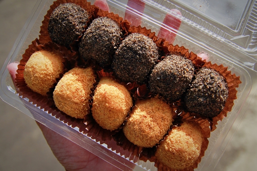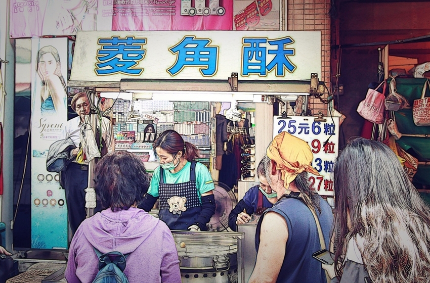 廟東夜市入口處附近的這家菱角酥也是不能錯過的人氣排隊小點心,25元6粒、35元9粒、50元13粒,100元27粒,每一粒菱角都沾完粉後下鍋油炸,炸起來一粒一粒圓圓的,吃起來外皮酥脆,裏頭包裹著菱角的香氣,口感真的很特別,會讓人不自覺得一粒一粒吃不停。