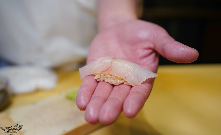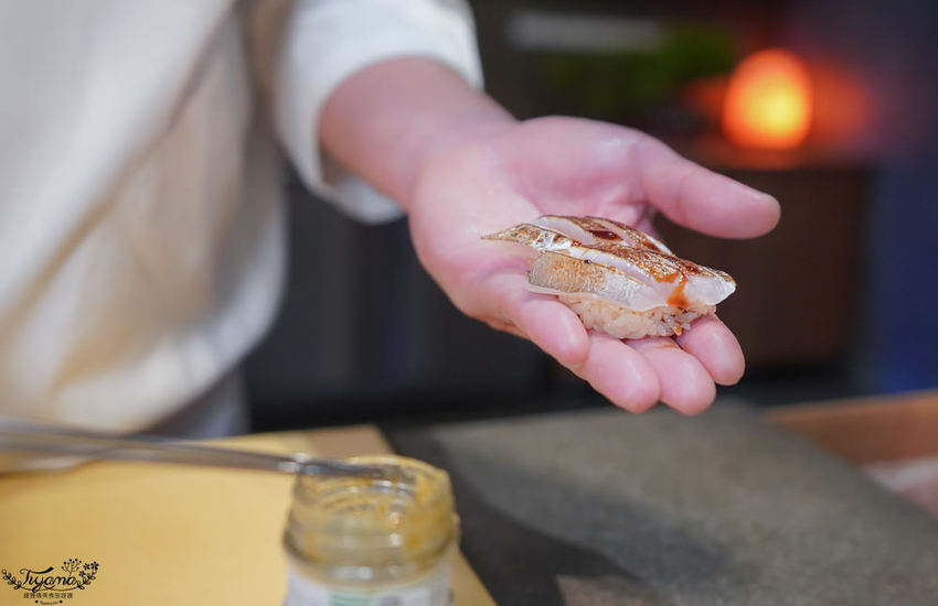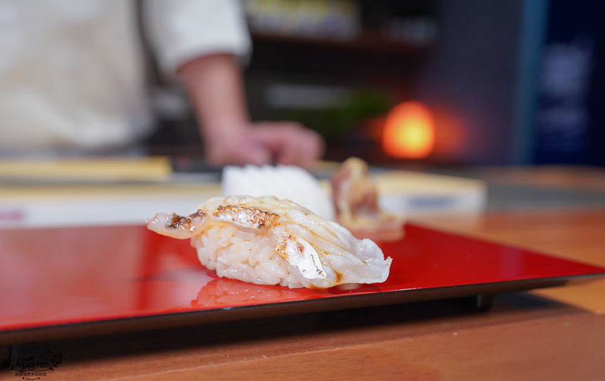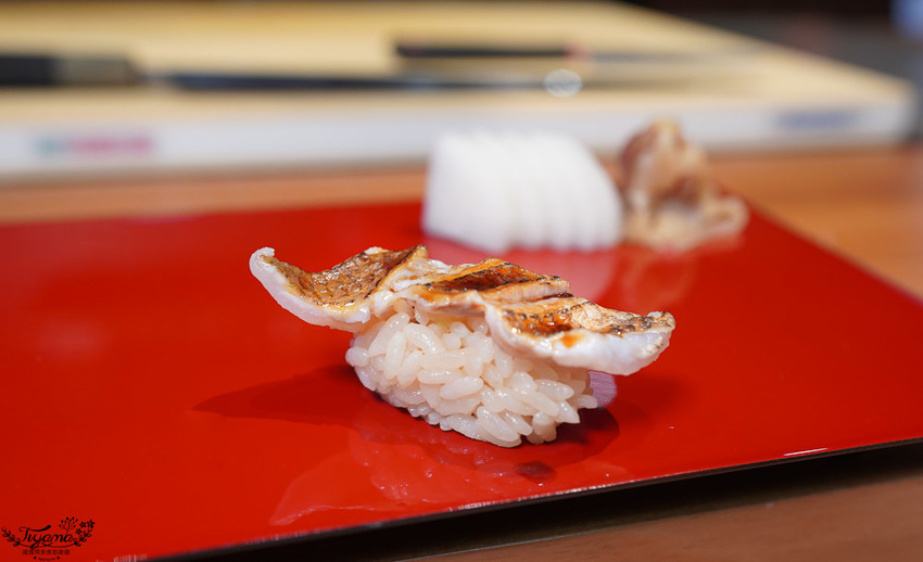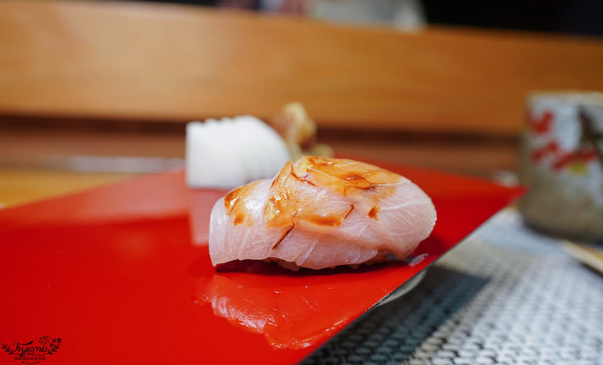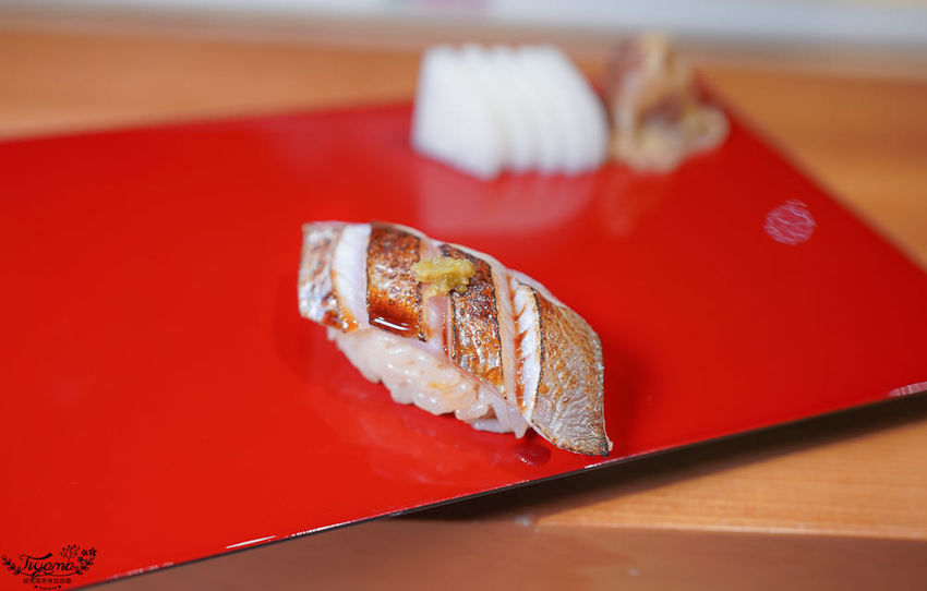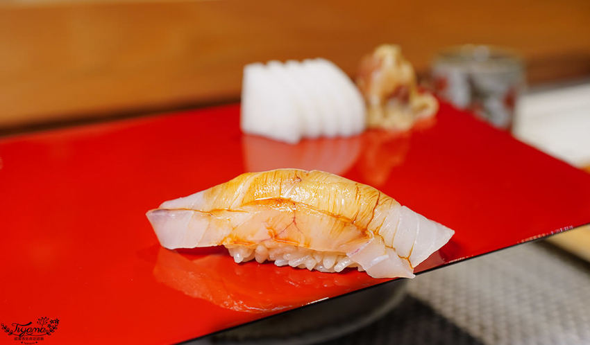 赤鯥(紅喉)肉質細膩,口感層次鮮明,吃到第3貫忍不住問師傅,為何吃到的炙燒香氣會這麼濃厚,全因江戶前壽司會經過熟成這道步驟,炙燒時會有加倍的炙燒香氣。