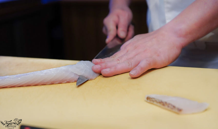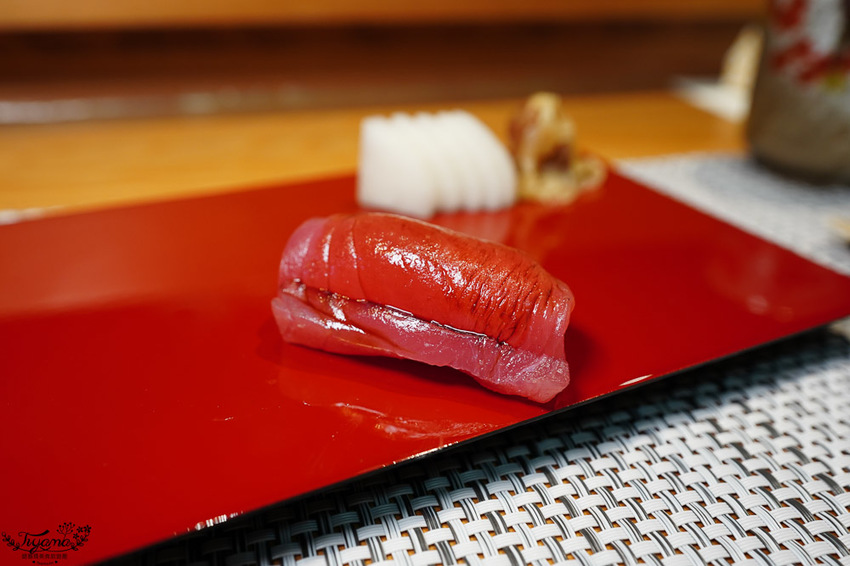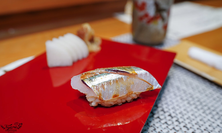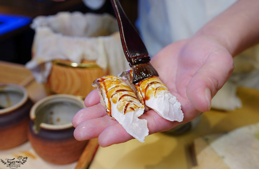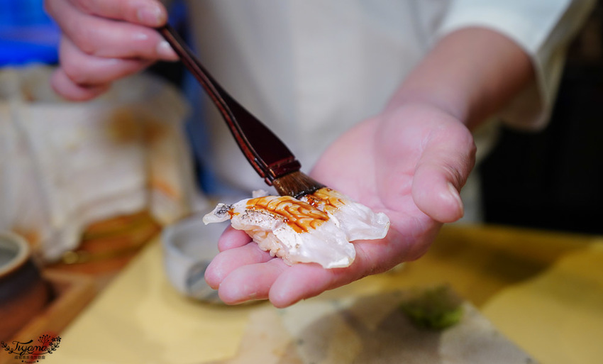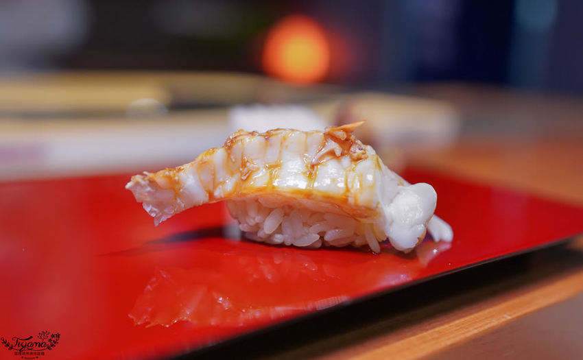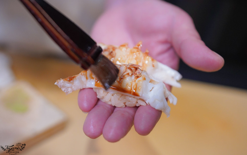 赤鯥(紅喉)肉質細膩,口感層次鮮明,吃到第3貫忍不住問師傅,為何吃到的炙燒香氣會這麼濃厚,全因江戶前壽司會經過熟成這道步驟,炙燒時會有加倍的炙燒香氣。