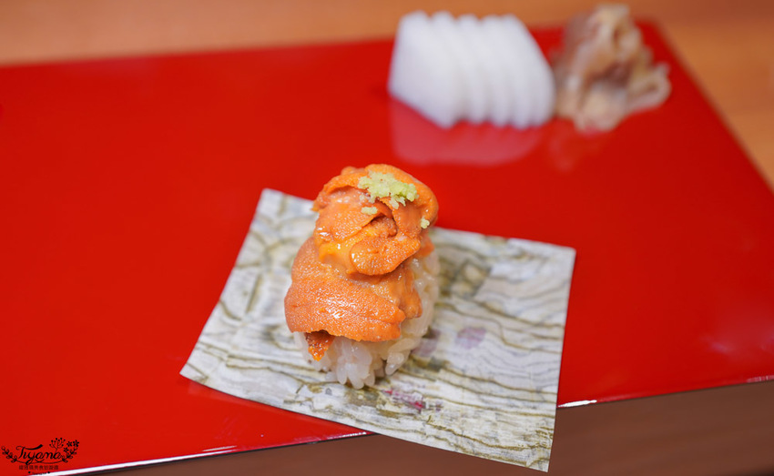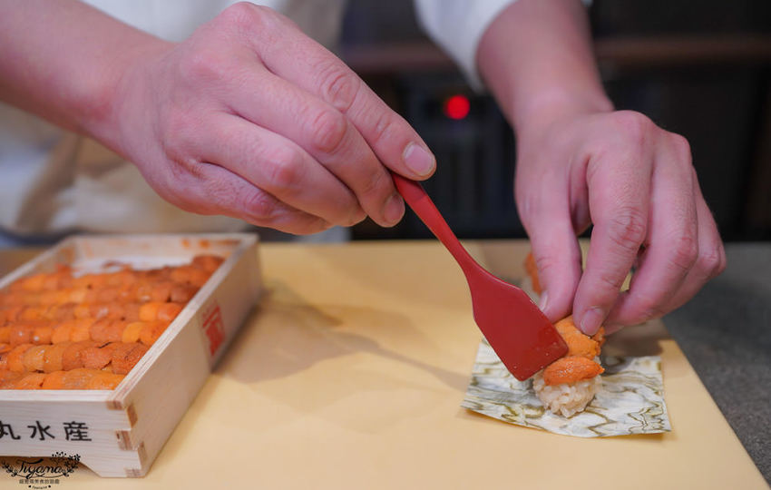 師傅是挑海膽的行家,沒通過他的水準考驗就無法送上板前,所以來「鮨本味」必吃就是赤海膽!!