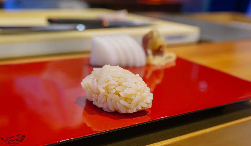 在接下來的重頭戲「握り」前,師傅先握一貫醋飯讓我們品嚐,江戶前壽司是溫熱醋飯,經過調味過後…帶點醬色,醋香鮮明,粒粒分明卻又Q香綿黏,加入生魚作成的握壽司,會減少並中和醋飯的醋酸程度,突顯握壽司的美味,所以醋飯與師傅握功皆是決定握壽司美味的關鍵。