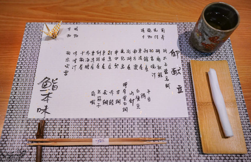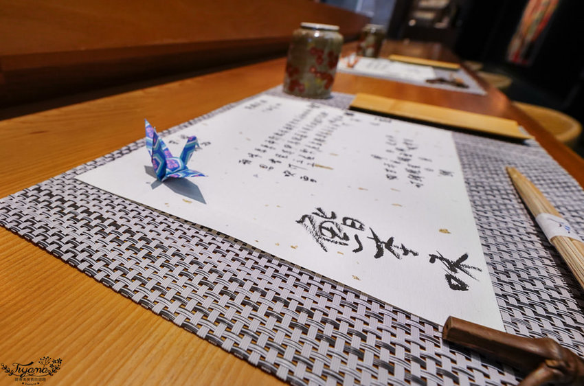 今天享用的「2500元|無菜單料理」,菜單是由師傅當日用墨水手寫的菜單,寫在金箔點綴的紙上,更顯對每位顧客的重視。
