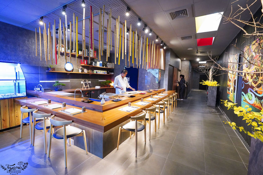 餐廳結合現代和日式設計,鐵灰色系讓空間增添無限延伸的寬闊感,板前座位區選用大量木製增添質感時尚的視覺感。