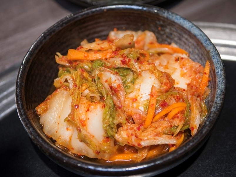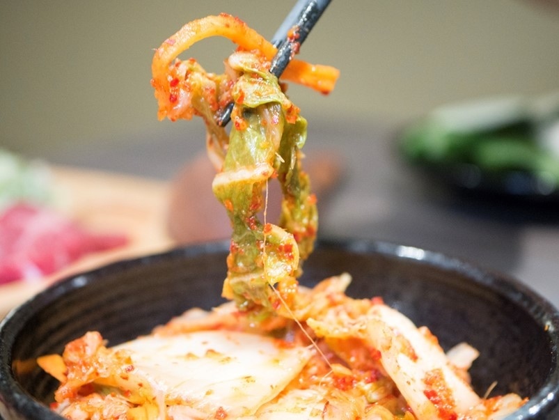 泡菜偏酸不辣,滿適合搭配肉片包進菜中,可以中和味道,讓吃法更豐富。
