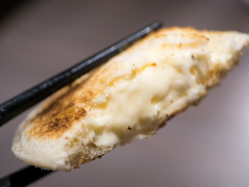 帶有點炙燒的香氣,薄薄的一片牛肉,涮上一點微甜的醬汁,加上本身的鮮美肉汁,趁熱吃很美味。
