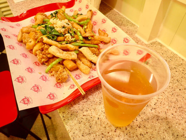 魷魚,魷魚炸的也恰到好處,肉質不硬,是屬於漿類的,但還是吃的出魷魚的味道,搭配蒜片跟胡椒吃也很好吃。