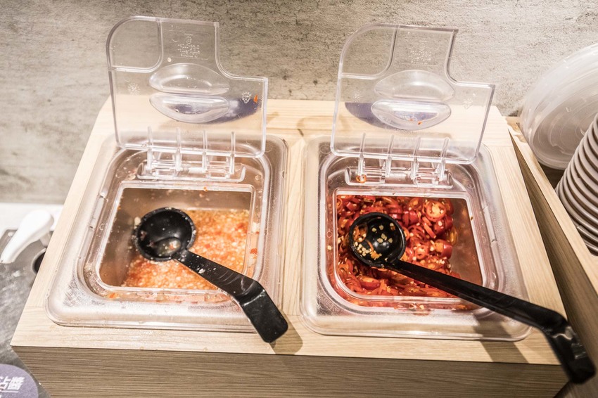 旁邊也有醬料自助區,提供蒜泥醋醬/紅辣椒兩種醬料,可以隨自己喜好添加,蒜泥醋醬很適合沾滷水,而肉骨茶加點紅辣椒可以提升口感層次