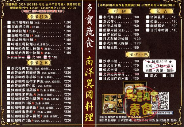 ▼台中的素蔬食餐廳越來越多了,今天來吃一家朋友介紹的南洋異國料理,多寶蔬食在南屯區大墩路靠近中港路,附近有春天素食餐廳、明心園素食館等等算是西屯區素食的一級戰區,南洋風的裝潢,跟平常吃的素食館截然不同,餐點分成套餐拉麵與套餐主食兩種系列,還有少見的藍帶朱排、沙嗲串燒及泰式炸G,套餐除了主菜都會附上一杯蜂蜜柚子茶及木瓜絲,菜色豐富,獨特的南洋風味,值得一試。