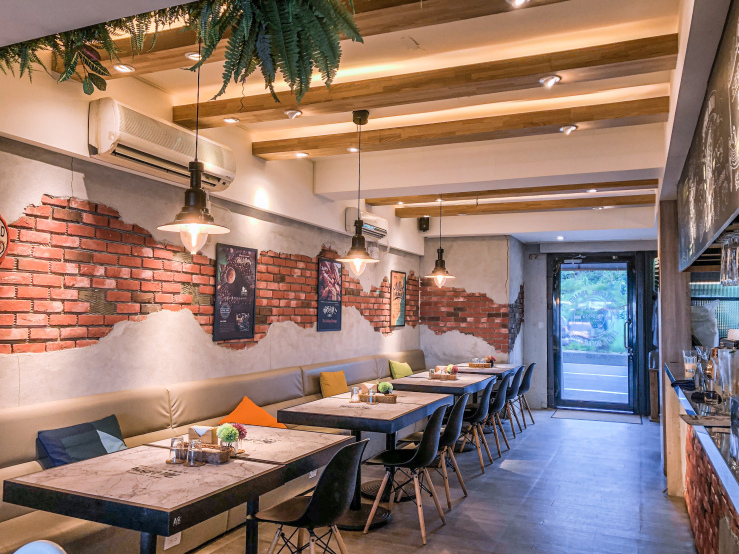 更增親自種植綠色植栽牆、手繪海鮮圖黑板、增設紅色醒目的沙發椅