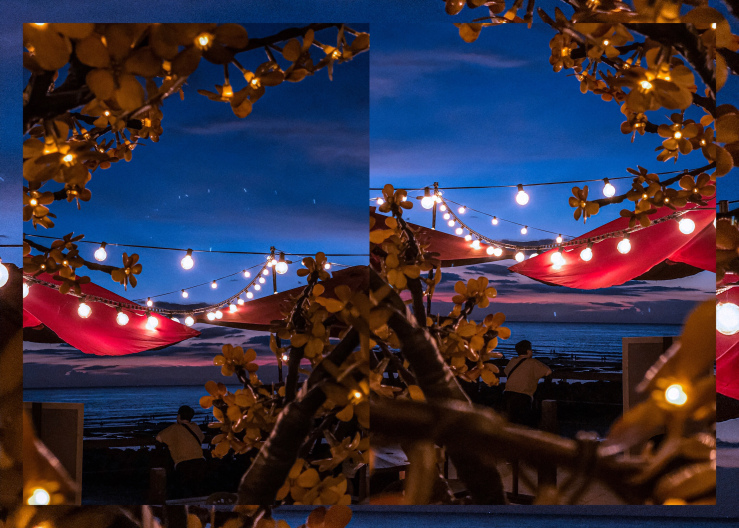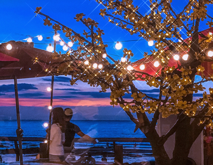 戶外區的小燈串亮起,一閃一閃映著夕陽顯得特別浪漫