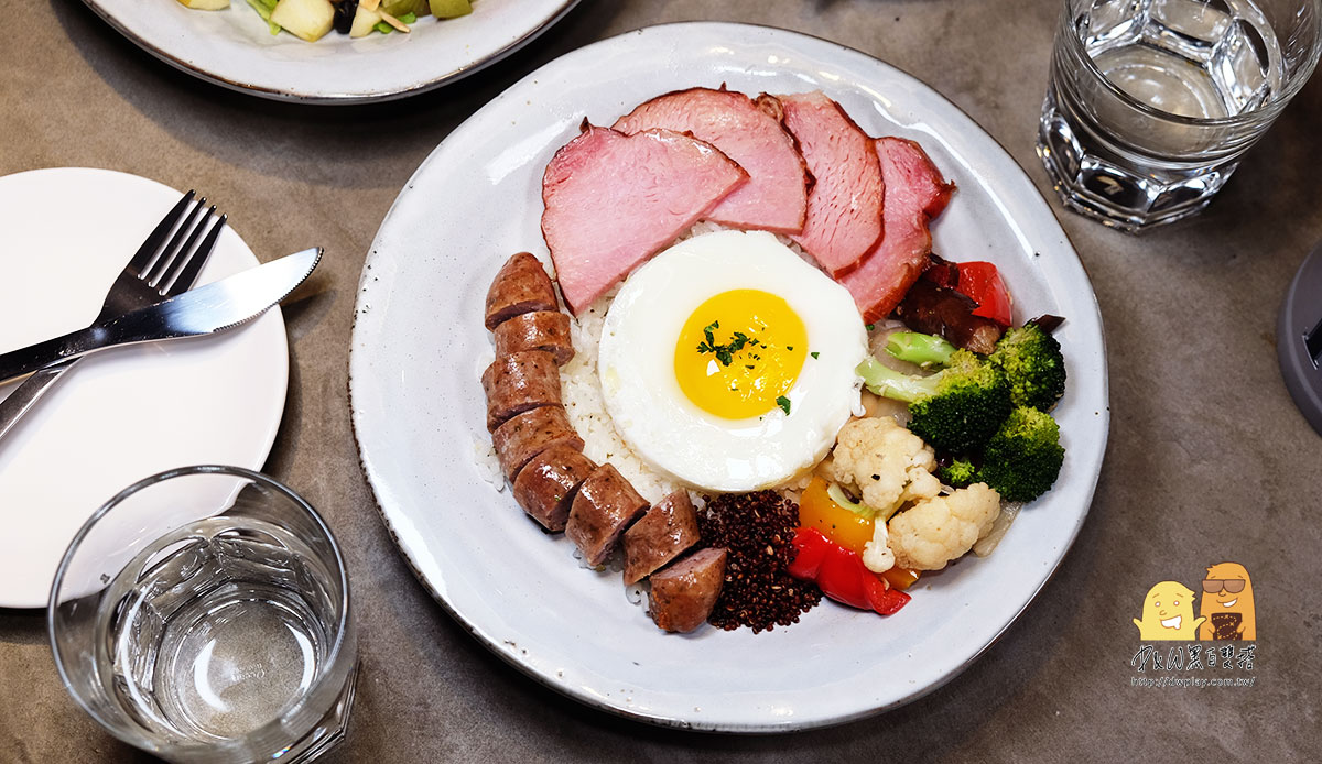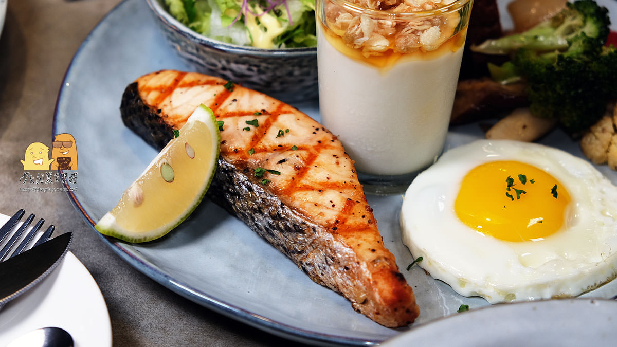 除了非常鮮嫩、超厚的烤鮭魚之外搭配了麵包、蜂蜜優格燕麥、沙拉、烤時蔬、太陽蛋