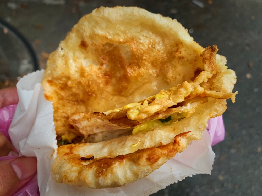 爆漿三星蔥多餅的蔥油餅是非油炸的蔥油餅加蛋一份35元,外皮酥脆內滑嫩,蔥花香氣十足,就算冷了吃也還不錯吃。