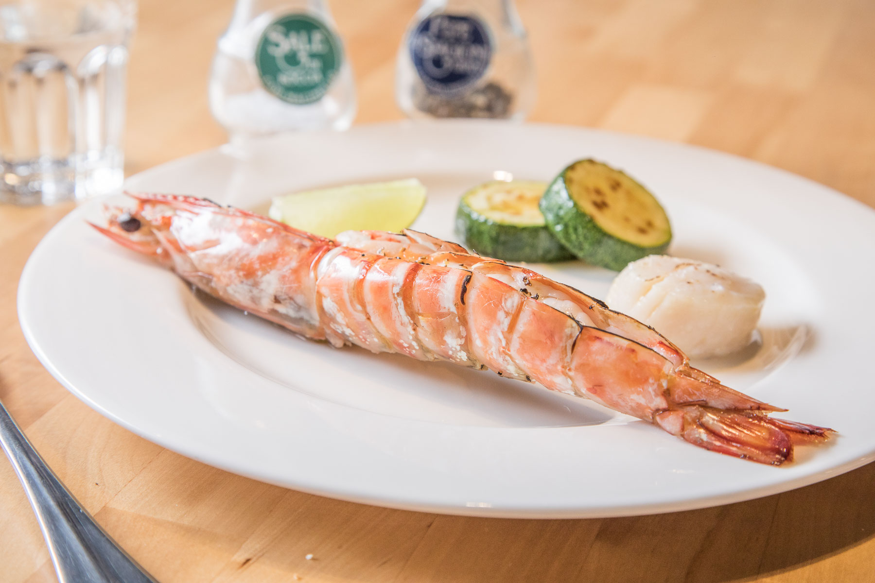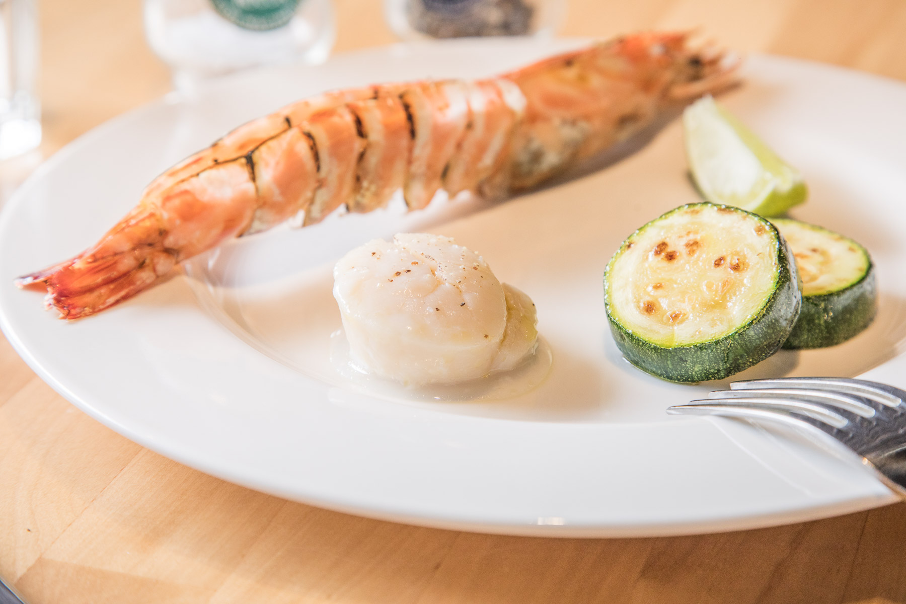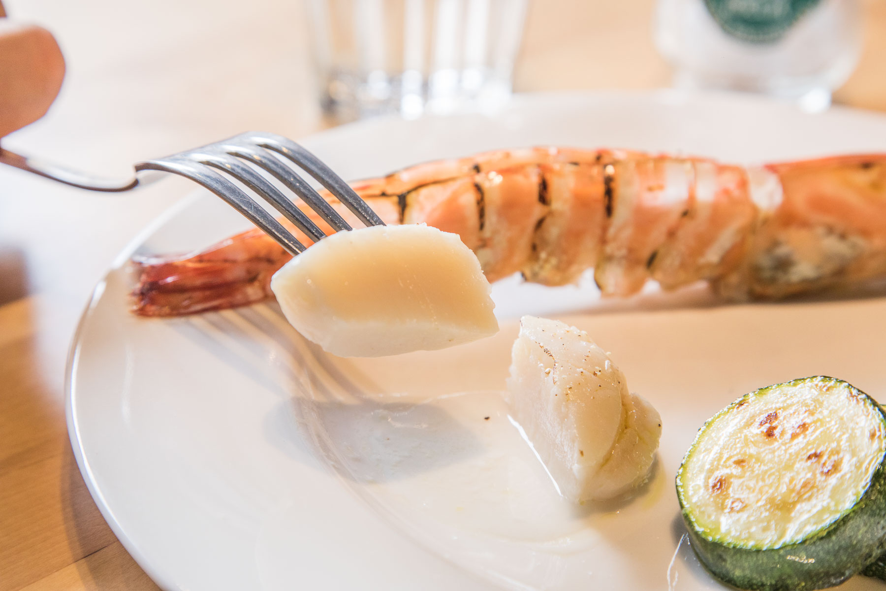 前菜是澎湖大明蝦及北海道生食級的干貝,同樣不走花俏路線,僅經過烤的工序,搭配台灣產櫛瓜