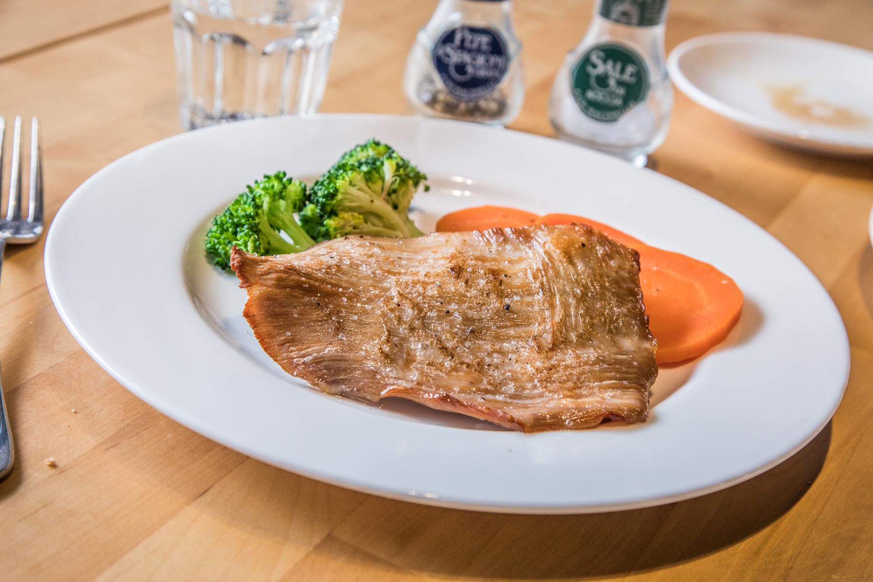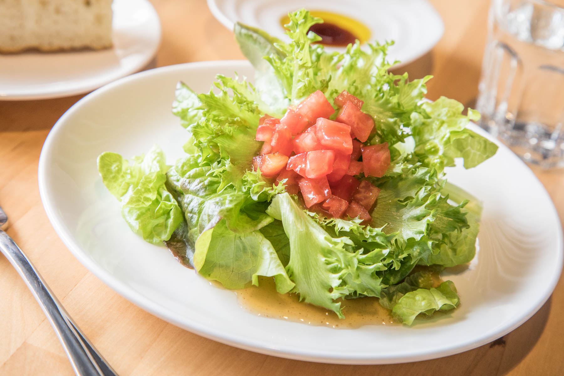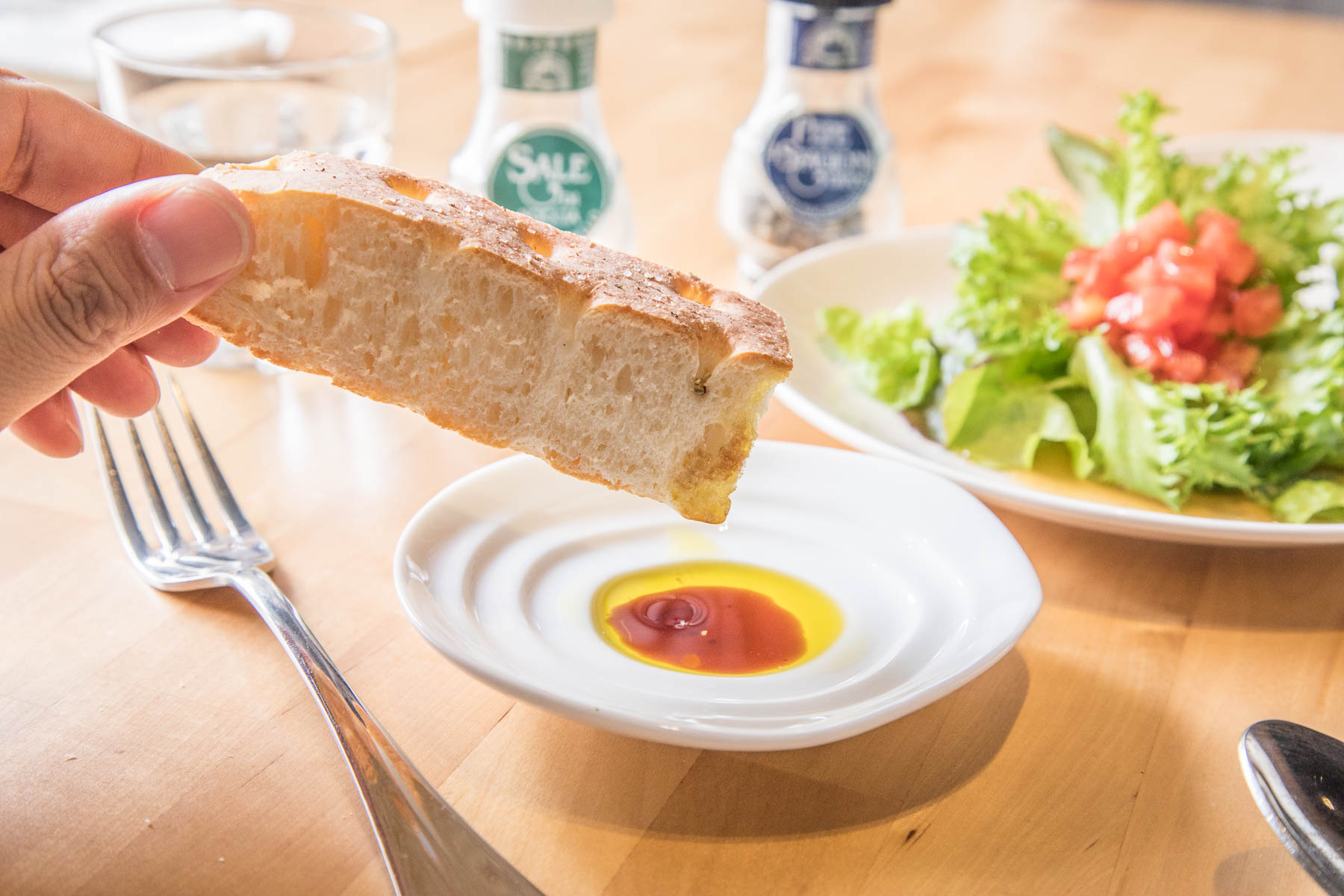 首先服務生端上麵包,也是老闆自製的佛卡夏,搭配頂級的橄欖油醋,佛卡夏外層烤到有些許焦黃色,口感富有彈性略帶咬勁,麵糰香氣十足,咀嚼時還帶有鹽香,越吃越涮嘴,這應該是目前吃過最好吃的佛卡夏!
