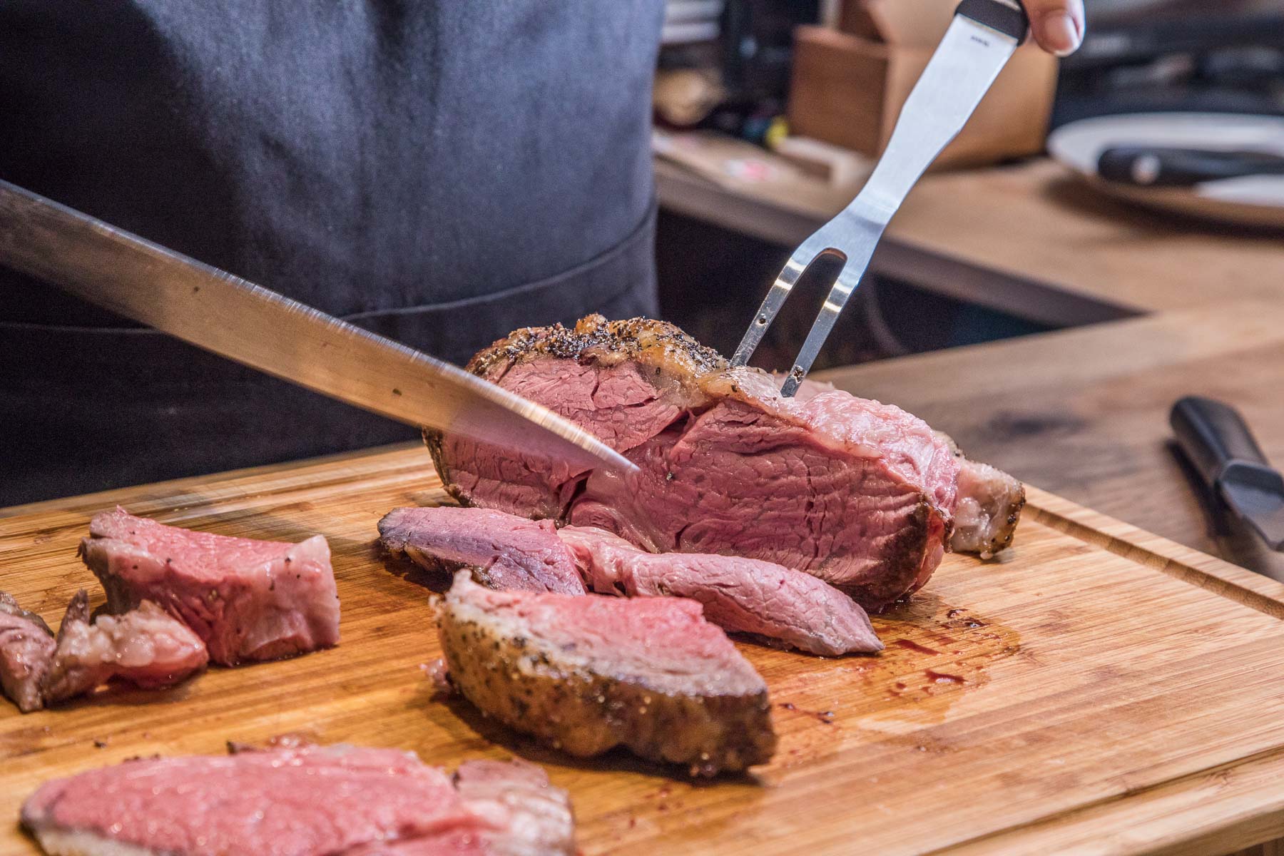 元食cafe的看板料理,沒有預約絕對吃不到,使用整塊的頂級肋眼牛排低溫慢烤兩個小時,主廚在分切牛排時,充沛的肉汁像是止不住地狂冒,粉嫩的紅色牛排,視覺上就是一大享受!