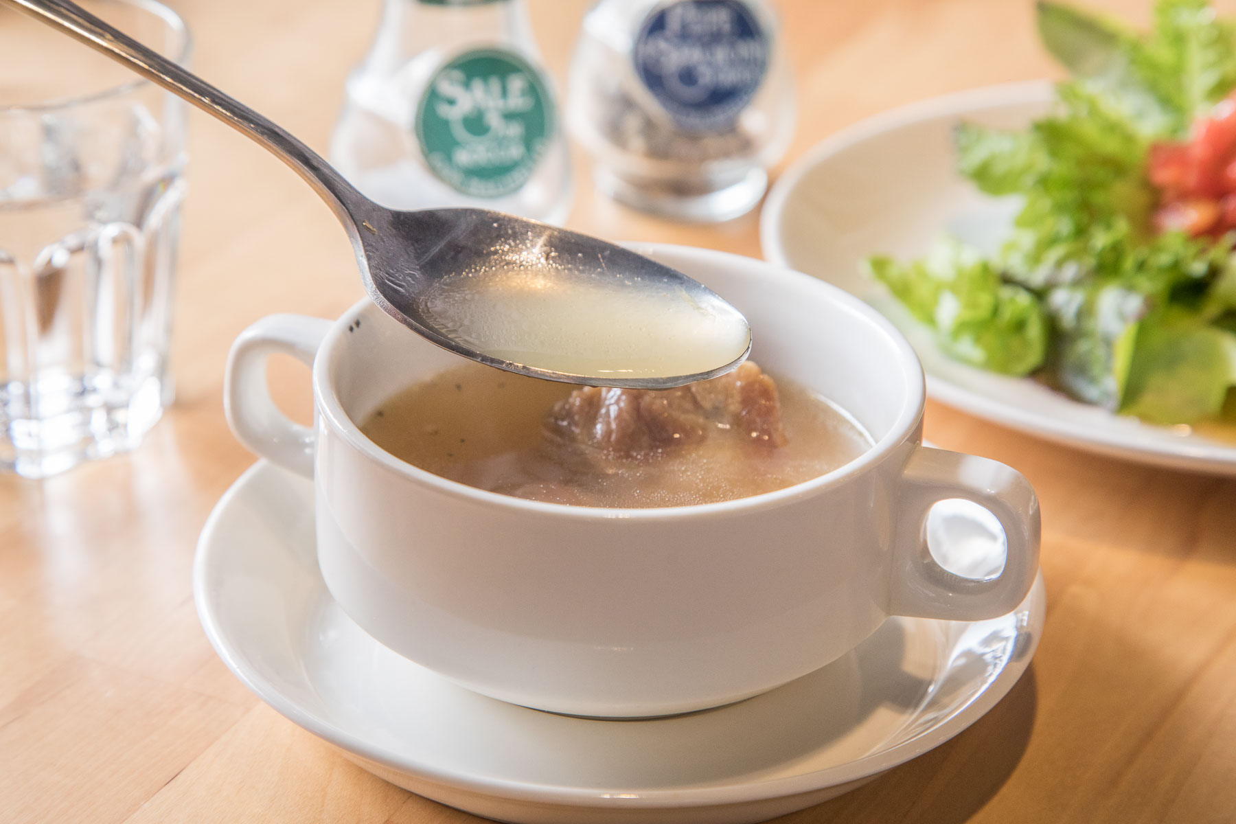 老闆先將究好豬小排烤過,在各種蔬菜熬製高湯,也因為究好豬的特殊風味,這碗湯不似一般豬骨熬湯那樣濃白,反而是澄清的色澤,究好豬的鮮味完全泌入湯中,看似清淡入口卻是相當濃醇鮮甜,滿滿究好豬的精華風味,而且厲害的是究好豬就算經過長時間的燉煮,豬肉本身仍舊保持著鮮甜的口感及肉香氣,鮮美的肉質從飼養階段就開始講究,究好豬追求人道飼養,讓豬隻有快樂生長的環境,肉質肥瘦比例自然剛剛好