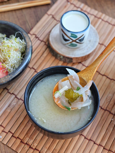 ▫️50元有找的銅板價就能讓你的丼飯升級2.0套餐版本,不加嗎?沙拉也不馬虎,三種不同生菜搭配胡麻醬:苜蓿芽、小黃瓜紅蘿蔔絲、高麗菜,還有小番茄呢。味噌湯以洋蔥熬煮出自然甜味,甜點則是手工奶酪哦!