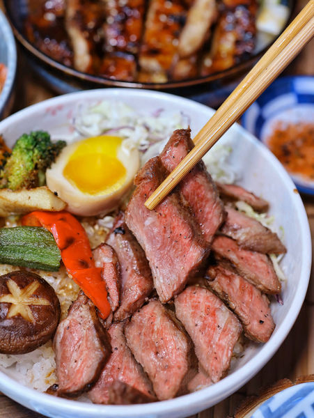 ▫️使用choice等級的翼板牛肉,含有細細的筋絡、口感略Q,嫩度適中帶油花,炙燒成五分熟剛剛好,目測超過10片的份量!配菜除了生菜絲、半顆糖心蛋,還有幾樣不同的烤蔬菜,以平價丼飯來說這樣的豐富性我覺得相當不錯!不過配菜部分店家有說明可能會依照季節更換請以現場為主囉。