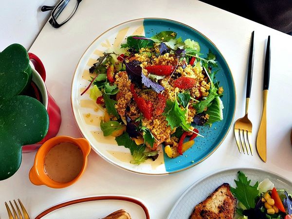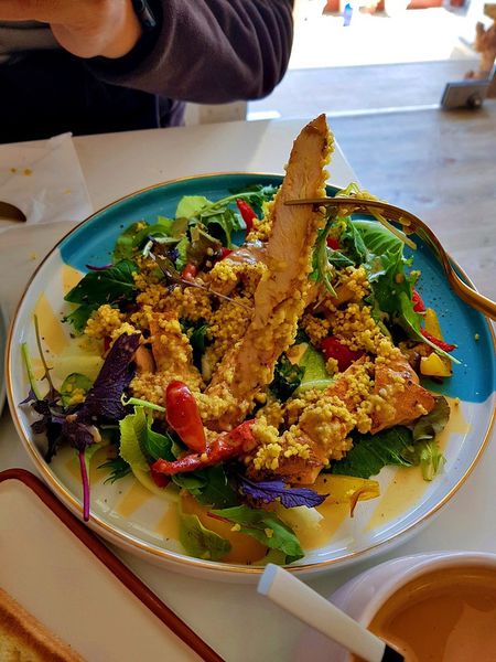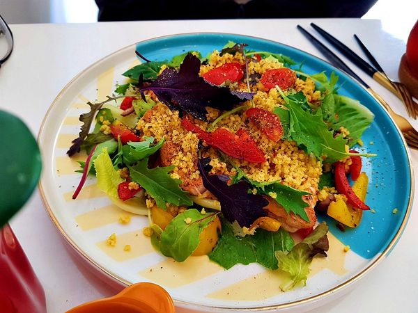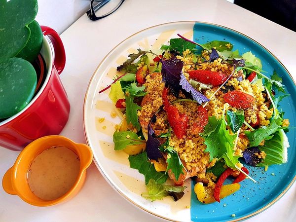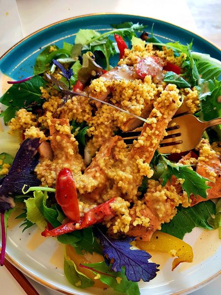 庫司庫司雞肉溫沙拉 $288 內含綜合生菜, 庫司米, 炒香料菇菇, 炒香料甜椒, 香煎雞胸肉
