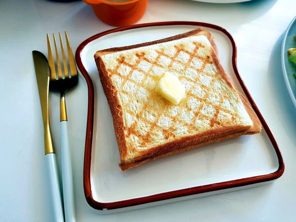 厚片吐司有壓花紋, 放在一樣是吐司造型的餐盤上, 感覺就讓人食指大動!