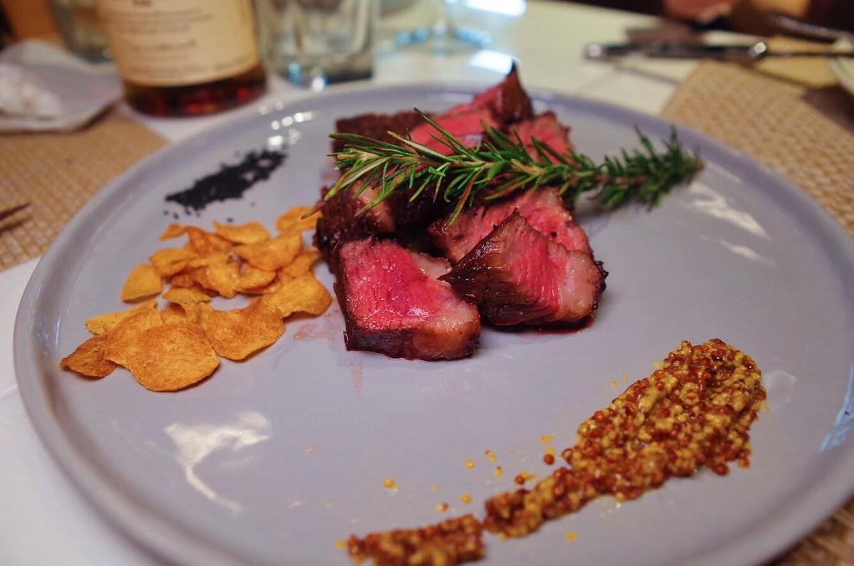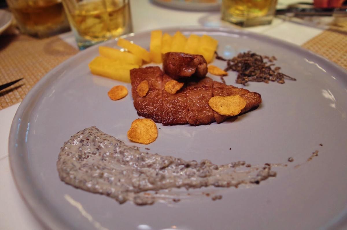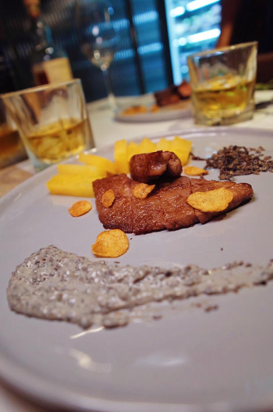 牛肉搭蒜片是絕配不需要我多說了吧?看你想沾鹽還是搭配蒜片,都非常美味!我覺得這道牛肉強的地方是在他的汁很多,煎的時間掌握得很好,不會太生也不會太熟,咬下去香味恣意,嘴巴都是牛肉香氣,油質跟肉也搭配的很剛好!