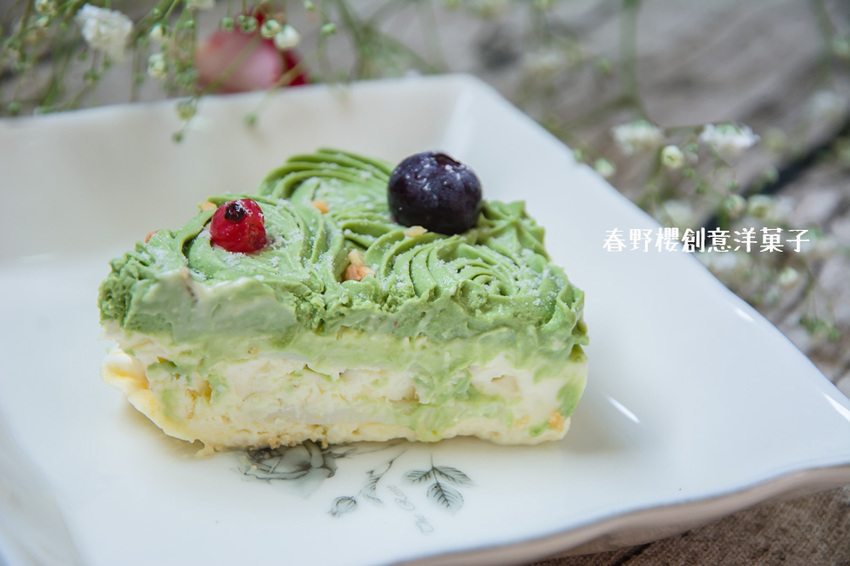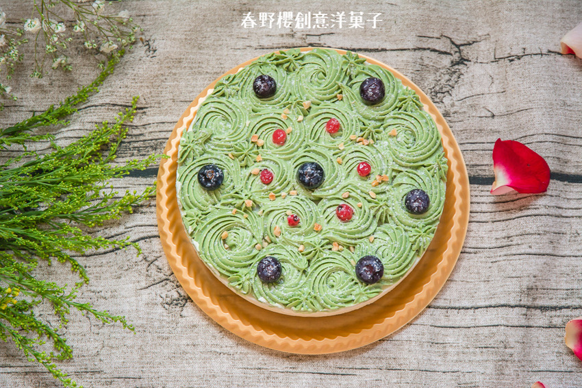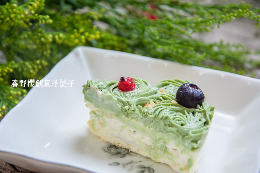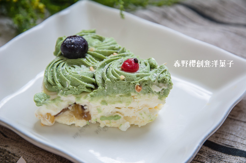 先來跟大家介紹一下外層的部分,上面擠花是用宇治抹茶製作的,吃起來有淡淡的抹茶香氣,但不會有苦味,再放上藍梅跟紅醋栗做點綴,