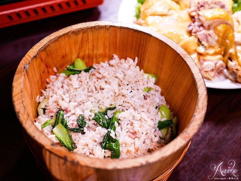 上桌時以木桶裝乘看起來氣勢就是強,有別於一般印象中的菜飯,青江菜並非剁碎而是片狀呈現,