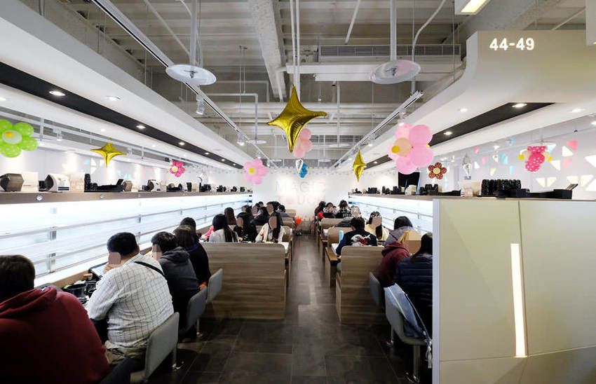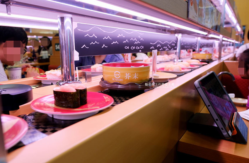 迴轉鍊上還有產品再推銷,看著看著,有沒有就點下去了?!上面是平板點餐的送餐跑道,底下是迴轉壽司的輸送道。