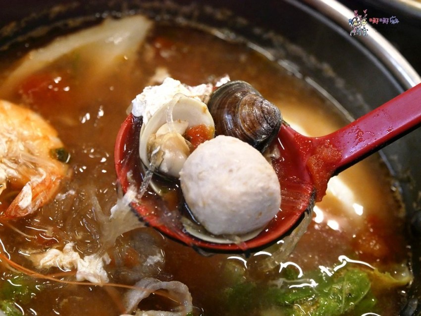 他鍋燒麵是不能選口味的,裡面都一樣的料,大概就是肉、蛤蠣、蝦子之類的海鮮和一些火鍋料,還蠻豐富的喔!