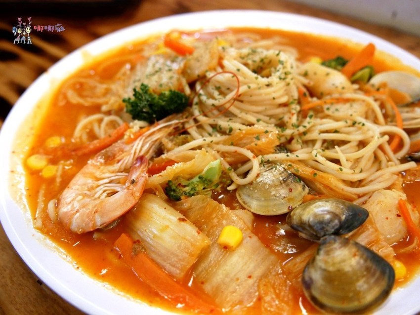 阿寶點的是泡菜海鮮綜合義大利麵,看起來其實蠻豐富的。