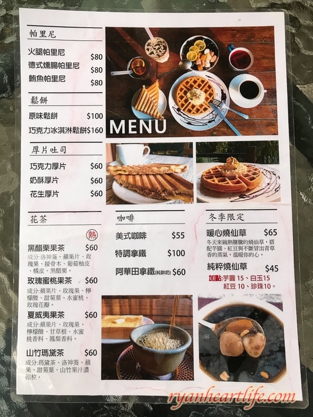 接著則是這裡的餐點介紹,看了看菜單上的品項,果然如同店門口招牌上所描述的一樣,大多都是以飲料、甜品和下午茶等輕食類為主~