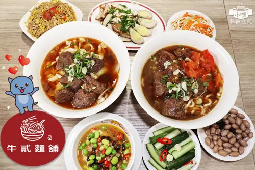 牛貳麵舖有紅燒牛肉麵、番茄牛肉麵、清燉牛肉麵、香辣酸菜牛肉麵,