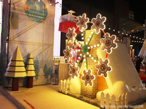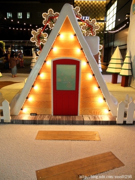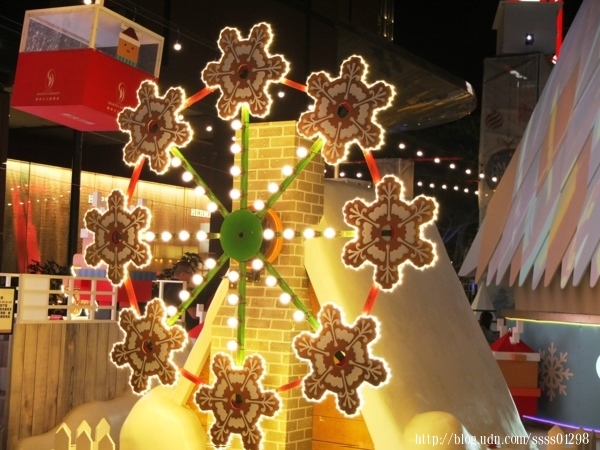 ▲北歐小木屋背面煙囪上有一座雪花摩天輪,閃閃燈光點亮幸福十分,超美的!