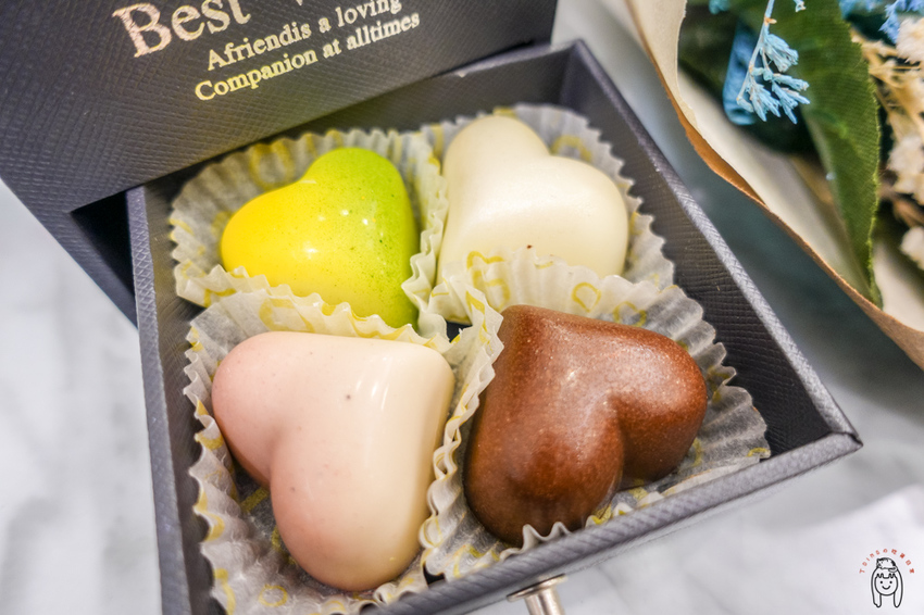 丁先推薦店內滿值得購買的巧克力,像這組巧克力禮盒,非常精緻而且會讓人有驚喜,上層有紅色的玫瑰花,打開底層會有四個愛心造型的巧克力,送給另一半最適合!這組禮盒也是店內情人節最受歡迎的禮物之一喔!