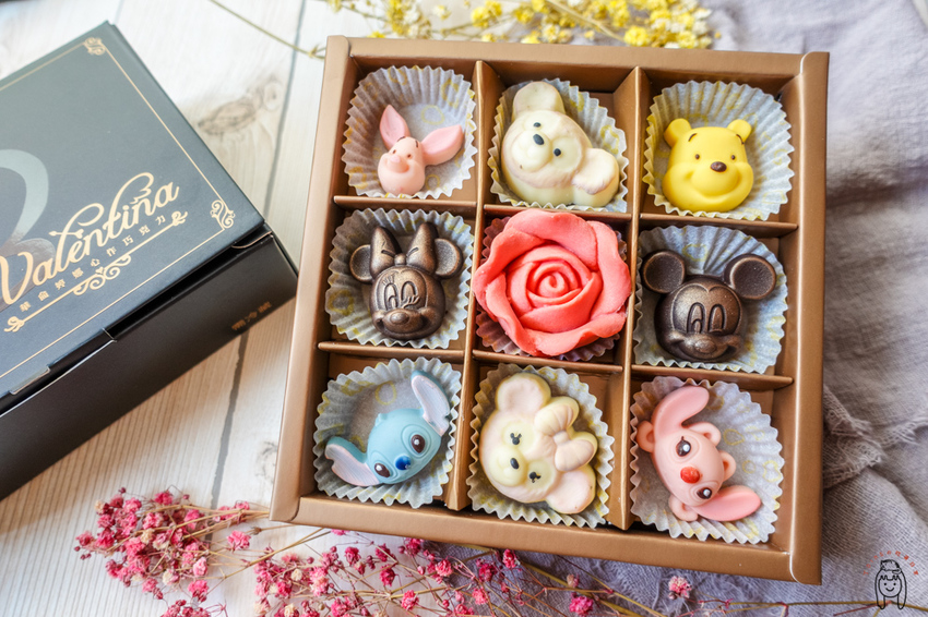而且有非常犯規的卡通人物,像是米奇、米妮、史迪奇、維尼等,如果剛好喜歡這些角色,一定會非常失心瘋,而中間玫瑰花的巧克力,因為還原度百分百,讓丁覺得這一禮盒根本就是巧克力藝術品,每一種都太精緻,太讓人喜愛了。