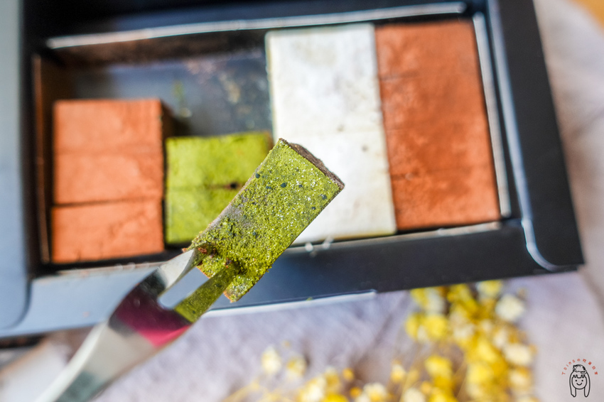 日式抹茶巧克力,一入口會先嚐到抹茶微苦茶香,在嘴裡融化後,巧克力的濃郁後韻,讓人吃起來充滿驚喜。