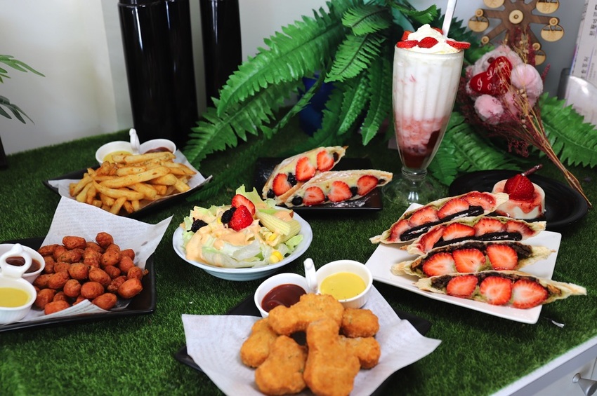 含:果實草莓歐蕾、(草莓珍珠戀戀卡士達/抹茶脆脆煉草莓/ 草莓抹茶戀Oreo,3選1 )、草莓鮮奶酪、炸物5選1、生菜沙拉